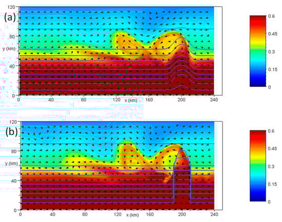 Same as Figure 6b, but for the canyon-upwelling scenario: (a) results for the full model configuration; and (b) results for the model run with uniform seawater density and zero friction. Note the variation of color ranges.