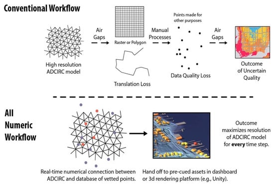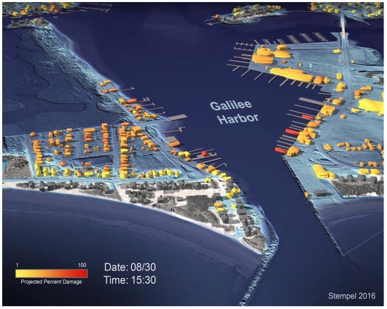 Methods to achieve the real-time connection of hazard impact models to ADCIRC are generally not elaborated in the literature. Methods for hazard impact modeling that have been elaborated largely rely on GIS software (e.g., ArcMap), and the effects are typically aggregated to show maximum possible impacts [2,5,6,7]. There is a recognition more generally that as modeling of phenomena, such as sea level rise, improves, that hazard impact models will need to be similarly improved to realize planning benefits for coastal communities [4,8]. There is also increased interest in integrating hazard impact models with visualizations that may display impacts to specific facilities (Figure 1) [9], and interactive 3D models for use in stakeholder engagement and on the web [10,11,12]. These integrations are distinct from methods that display inundation in such platforms as Google Earth, because they allow for highly individualized control of 3D assets (representations of structures, debris) [13].