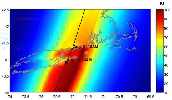 This study used a newly developed high-resolution hurricane boundary layer (HBL) model to provide physics-based simulations of surface winds during hurricane landfall. At landfall, the hurricane usually encounters a rougher surface with increased friction. The roughness length of the sea is of the order of a few millimeters, while land roughness lengths are typically several centimeters for open fields, and are greater for forested or urban areas. This change in the surface friction affects the near-surface wind structure. The hurricane boundary layer model, originally designed for open ocean hurricane studies [25,26], has been adopted for landfalling storms as part of the coastal resilience project at University of Rhode Island (URI) funded by the U.S. Department of Homeland Security (hereafter URI HBL). It is based on a dynamical approach that utilizes the physical balances in the dynamic equations to determine how a hurricane responds to local variability in the surface conditions (primarily topography and surface roughness). Figure 2 depicts an example of the coastal wind swath (maximum sustained wind experienced during the storm passage) that is produced by the URI HBL model for Hurricane Carol (1954), the most destructive hurricane to strike southern New England since the Great New England Hurricane of 1938. The National Weather Service in Warwick, Rhode Island recorded sustained winds of 90 mph, with a peak gust of 105 mph.