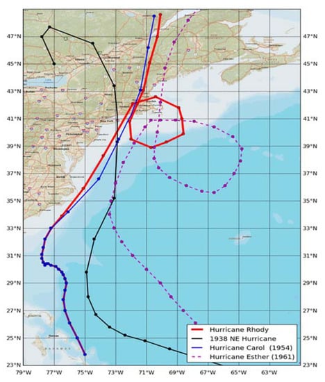 Hurricane Rhody track. Historical tracks of the 1938 New England Hurricane, Hurricane Carol (1954) and Hurricane Ester (1961) are shown as well. Image: Authors.