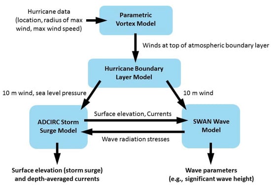 Storm surge response to the modeled hurricane wind and atmospheric pressure fields was computed using the ADCIRC model coupled with the Simulating Waves Nearshore (SWAN) model (Figure 4). ADCIRC is a finite element model that, in the 2-dimensional mode employed here, solves for water level using the generalized wave continuity equation (GWCE) and depth-averaged current using the shallow water momentum equations [18]. SWAN is a third-generation, phase-averaged wave model for simulating wind waves in coastal and open ocean regions [27]. ADCIRC and SWAN are coupled by passing the wave radiation stress computed from the SWAN wavefield to ADCIRC and passing the water levels, currents, and frictional parameters from ADCIRC to SWAN [28]. Both models are run on the same unstructured mesh using triangular elements. Further details of the storm surge simulation model are described in Dietrich 2011 [28].