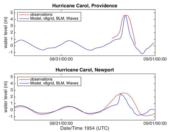 Time series of water level at Providence (top) and Newport (bottom) during Hurricane Carol. Observations are shown in red and model output is denoted by the blue lines. Image: Authors.
