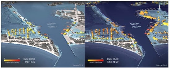 Progressive hazard impact model depicting the landfall of hurricane Carol at the port of Galilee, Rhode Island, USA, at present sea level and build out. Hazard impacts for each structure are calculated using the all numerical method and displayed for each timestep (2 shown). Outputs are configured to be directly used by the 3D visualization platform such that damage levels may be displayed for any timestep and updated dynamically. Image: Authors.