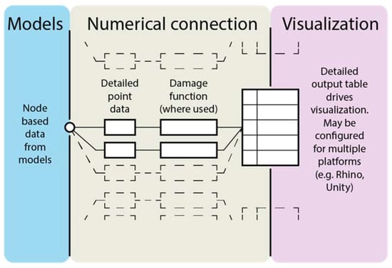 Basic workflow from model(s) to visualization. Output tables may be directly linked to information dashboards or designed to be ingested by visualization platforms such as Unity. Image: Authors.