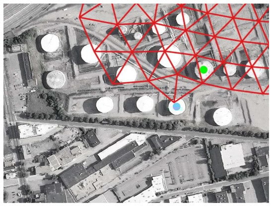 Figure 10. Example of a point with three adjacent nodes (green) and point beyond the nearest wet node (blue). The red lines represent wet portions of the unstructured ADvanced CIRCulation model (ADCIRC) grid. Points tested are both inside and outside of the grid, and constrained by a basin analysis. Image: Authors (Air photo: Rhode Island Geographic Information System (RIGIS)).