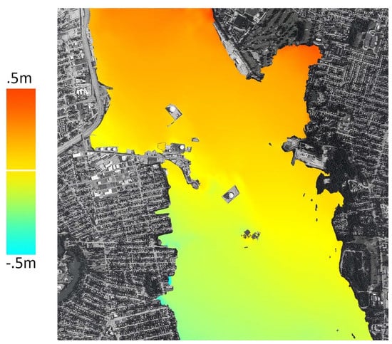 The fundamental innovation of the all numeric method is relating the geographic point and its attributes directly to the sea surface, as described by the unstructured grid. ADCIRC contains an inbuilt function to interpolate sea surface elevation at preset recording points [18]. When this is accomplished using outputs of the ADCIRC model (as opposed to direct integration), interpolation may not be necessary. The advantage of not using interpolation is speed of analysis over multiple timesteps on a laptop or desktop computer. As an example, a sensitivity test was performed in an area of concern in analyses, the Fields Point area of the Port of Providence. This analysis entailed testing the first, second, and third nearest neighbors of 12,176 nodes. The horizontal distance ranged between 22.8 m apart and 73.9 m. The variation reflects the optimization of the unstructured grid to fit the topography (e.g., greater node separation where less detail is required).