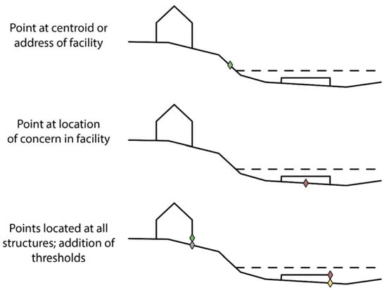 A point located at the centroid of a land parcel, for instance, may not reflect a specific vulnerability and could thus yield a false positive or negative (e.g., the facility in question is at lower or higher elevation than the point). To the extent that highly specific outcomes are predicted and potentially visualized using data made for other purposes, there is a danger that the certainty of outcomes is overstated and misleading [19,20,22]. The implementation of this approach thus requires careful attention to issues of data quality and the representation of outcomes.