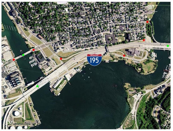 Comparison of points located at highway access ramps and bridge ends (red points) to span centers (green points). Before being corrected, span elevation was recorded as the channel bottom (bathymetry). A more logical way to determine whether a span would be compromised would be to ascertain elevation based on the underside of the span (direct impact/shear failure) or at pier locations (scour) [32,33]. Image: Authors (Air photo: RIGIS).