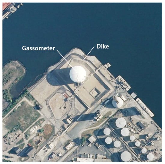 Ground truthing is also necessary where micro-topographical conditions are invisible to the ocean model. Such is the case with armored concrete reinforced protective dikes that surround liquified natural gas storage tanks in the Port of Providence (Figure 14). These types of conditions have necessitated the development of special attributes within databases that were developed for the IEMC and other projects. The presence of these dikes, including the threshold at which they are overtopped, is included in the point data representing the tank. Although wind damage to petroleum storage tanks was not specifically modeled for IEMC, these facilities serve as a primary example of points that can have multiple damage modes (e.g., buoyancy, wind damage) [34], and thus may require data for multiple analyses.