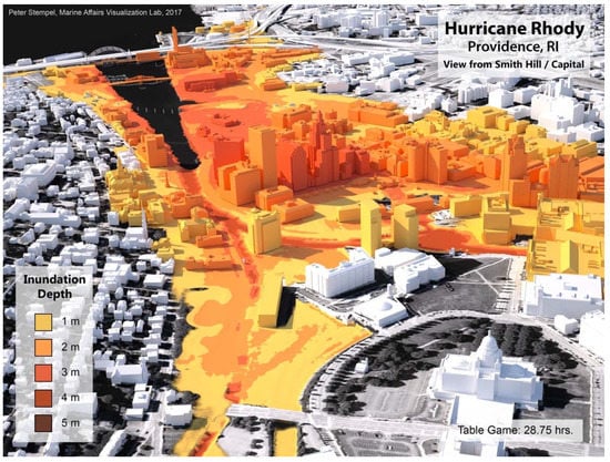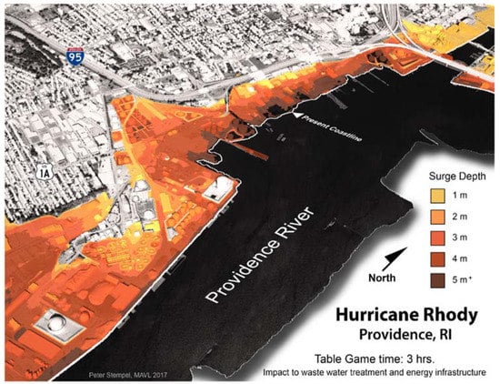 This work integrated advanced hydrodynamic modeling using ADCIRC and SWAN with purpose made geographic information using an all numerical method. Geographic databases were verified against real conditions and were developed in close collaboration with RIEMA and local facility managers to ensure suitability. The implementation of these methods as part of the IEMC suggested that there was merit in the use of time incremented impact analysis to better understand the progression of storm impacts. For instance, impacts of the 1938 Long Island Express Hurricane that is often referenced by citizens and emergency managers in Rhode Island unfolded with particular swiftness for much of the state [47,48]. The simulated storm used for the IEMC, by contrast, combined rapid storm surges and lingering rain and wind effects over multiple days. The effects of the volume of rainfall generated by the storm was more similar to Hurricane Harvey, which made landfall two months after the exercise, than it was to the Long Island Express [47,49]. The catastrophic effects of rainfall of Hurricane Harvey are a stark reminder that hurricanes may do damage through means that are not anticipated by the public or emergency managers [49], and that may be very different from previously experienced storms. This may be especially important at a time when, through the use of high-resolution modeling, we can anticipate the possibility of highly unlikely but catastrophic events [50].