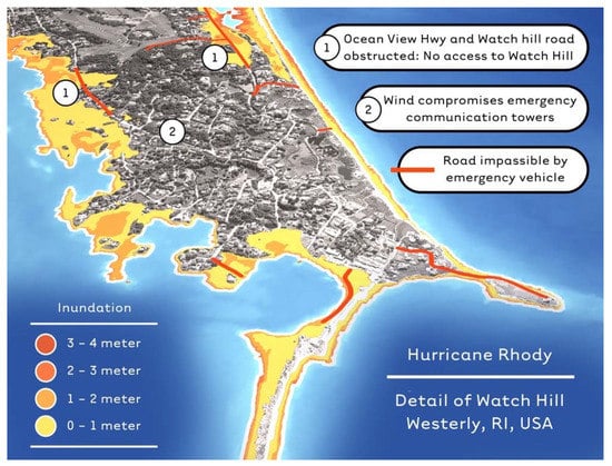 The concept of using thresholds or triggers to define inter-related impacts of storm events is drawn from approaches to planning that seek to organize responses to uncertain future conditions and interdependencies [40,41,42]. In these planning processes, thresholds are identified for different levels of future hazards to assess future vulnerability [40,41]. As it pertains to the methods that were used by URI, quantifiable triggers related to measurable effects of wind, rain, and inundation were collected to be used as model inputs to be tested against storm scenarios and incorporated into databases tested against the relevant models. Where multiple factors contributed to a specific impact (e.g., the combination of wind and ground saturation from rainfall), connection between models was made manually. In future iterations, it is conceivable that such hand offs could be made automatically between parallel models referencing a common point database.