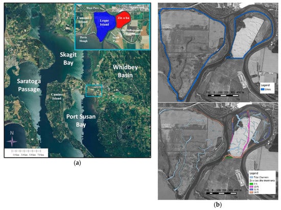 Puget Sound is a complex system of estuaries, basins, deltas, and habitats located at the northwestern coast of the USA. It houses large populations of birds, marine mammals, and fish. Puget Sound supports a massive community of hunters, fishermen and nature enthusiasts, etc. Over the last 150 years, economic development in Puget Sound has resulted in the alteration of habitat-sustaining processes and significant losses of wildlife habitat and fishes. A series of engineering activities such as the construction of dikes for irrigation practices that took place over a period of approximately 100 years has been recognized as one of the major causes of those habitat changes and losses []. In addition, the condition of these historic perimeter dikes in many Puget Sound estuaries has deteriorated and has become a concern from a maintenance, environmental issues and economic perspective. A potential long-term solution to the flooding, environmental and dike maintenance issues, while also providing ecological benefits of restored tidal marsh habitat with the goal of recovering the salmon fishery in Puget Sound, is nearshore restoration through dike removal or breaching. This has been actively evaluated by Washington State Department of Fish and Wildlife (WDFW), the U.S. Army Corp of Engineers (USACE), and the National Oceanic and Atmospheric Administration (NOAA) together with sovereign Indian nations [,]. This is also the case at “Leque Island” and “zis a ba” sites close to the mouth of Stillaguamish River estuary, where restoration actions have been proposed, and is the subject of this assessment.