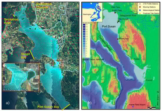 (a) Baseline model grid of the Skagit and Stillaguamish River estuaries including Skagit Bay, Port Susan Bay, and the Leque Island and zis a ba. The inset shows detail the Leque Island and zis a ba project sites. (b) Oceanographic observation stations at Port Susan Bay, October 2005.