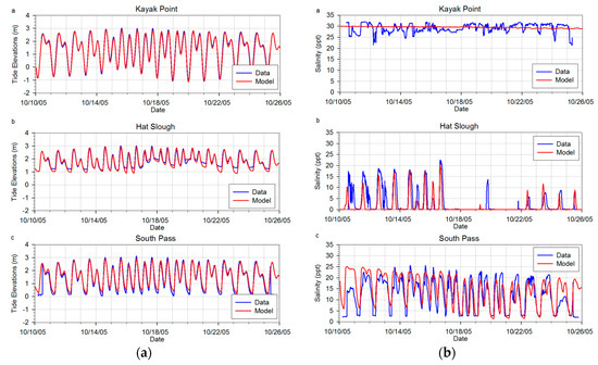Predicted water surface elevations are in good agreement with the observed monitoring data at the Kayak Point, Hatt Slough, and South Pass Stations (Figure 3a). The spring-neap tidal cycle and the diurnal variation were well reproduced in the model. Predicted high and low tidal phases also were matched well with observed data. The predicted tidal range at the Kayak Point station ranges from −1 to 3 m as also observed in the Puget Sound coastal region. Weaker tidal elevations were found at South Pass and Hatt Slough. The tidal ranges at South Pass and Hatt Slough were in the range of 3 m and 2 m, respectively, due to the effects of shallow water depths and river backwater. During the high-flow event from 17 to 21 October 2005, tidal elevations at Hatt Slough and South Pass were further elevated because of the river backwater effect.