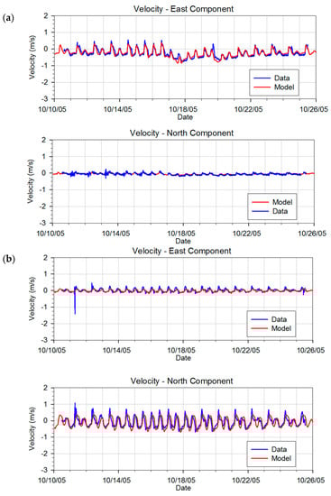 Comparison of predicted and measured velocity components at the Hatt Slough (a) and South Pass (b) stations, respectively. Data is from mid-depth of the water column.