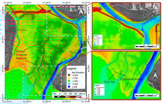 Figure 6 shows a model grid detail corresponding to the preferred alternative at the zis a ba site. Unlike the Leque Island site, the perimeter dike was lowered to a specified elevation and breached at a number of locations. The preferred alternative design includes sustaining a partial section of dike adjacent to the southwest bank of the OSRC. Also, as shown in Figure 6, the design includes a north-south oriented berm that divides the site into two drainage basins. More details on the zis a ba restoration design can be found in the zis a ba restoration project design []. The design widths of tidal channels vary between 2 m and 26 m and depths vary between 0.5 m at the mouth of the channels and approximately −2 m at the upstream end of the channels.