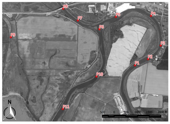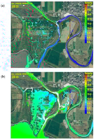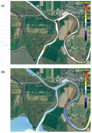 The performance of the proposed restoration actions during high-river-flow conditions was evaluated primarily to assess potential erosion and deposition concerns. The high flow was defined as the bank-full flow condition of 750.62 m3/s. This flow was determined through sensitivity tests reported in Whiting and Khangaonkar []. The sensitivity test was conducted by increasing daily average flow values in increments of 566 m3/s of the 16-day period in October 2005. Locations along both the Old Stillaguamish River and Hatt Slough were selected to identify where overtopping seemed most likely to happen. The final flow of 750.62 m3/s was selected as the design high-flow value that the river system could sustain before overtopping occurred.