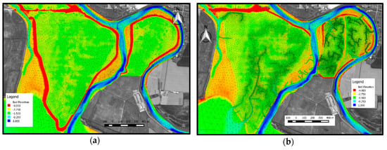 (a) Baseline scenario grid overlaying the bed elevation map. (b) Preferred restoration alternative scenario grid overlaying the bed elevation map.