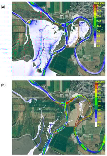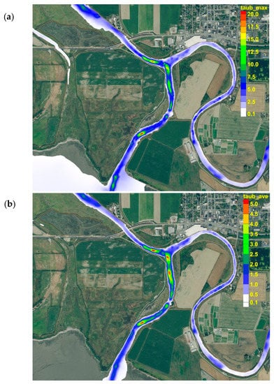 Horizontal distribution of maximum (a) and mean bed shear stress in Pa (b) for the baseline scenario for the high-flow (bank-full) condition at 750.62 m3/s.