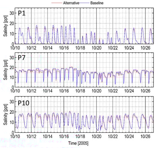 Preferred vs. baseline scenarios: time series of Salinity at Station P1, P7, and P10 for typical estuarine conditions (October 2005).
