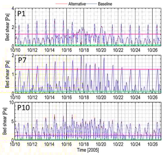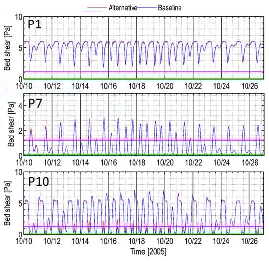 Preferred vs. baseline scenarios: time series of bed shear stress at Stations P1, P7, and P10 for bank-full conditions at 750.62 m3/s river flow (tides and wind corresponding to October 2005). Critical bed shear for the erosion of sand (0.11 Pa) and gravel (1.26 Pa) is marked as green and pink lines.
