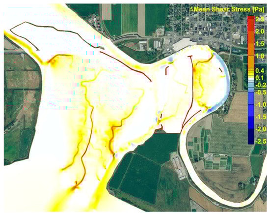 Mean difference bed shear stress contours of the preferred restoration alternative scenario relative to the baseline scenario at the high-flow (bank-full) condition at 750.62 m3/s.
