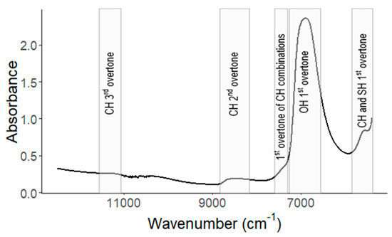 NIR spectroscopy produces broad, overlapping absorbance bands as a result of the overtones and combination bands of the fundamental vibrations (Figure 1). Being less interpretable compared to the sharp absorbance bands produced by the fundamental vibrations in the MIR region, NIR spectral bands require multivariate data analysis for the extraction of relevant quantitative information from the samples. In applications where the number of p variables is much larger than the number of N samples, reaching thousands of highly correlated and noisy variables (as is the case for IR spectroscopic applications), projecting the data onto a subspace preserving the most relevant information stands as a very powerful modeling direction. Partial least squares (PLS) regression constructs an orthogonal basis of a few latent (not directly observed) variables (LV) from the observed predictor matrix X, in such a way that they are maximally correlated with the response variable Y [12,13,14]. PLS modeling stands as the gold standard in IR spectroscopic applications, being successfully applied across many areas of research closely related to the topics of this study, particularly food control and public health [15,16,17].