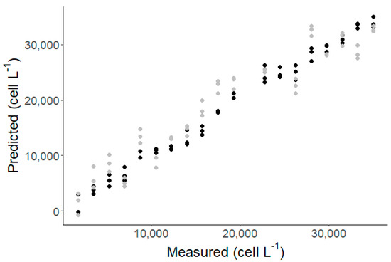Relationship between near infrared (NIR)-predicted values and Gymnodinium catenatum cell counts by light microscopy (black and gray dots are calibration and validation samples, respectively).