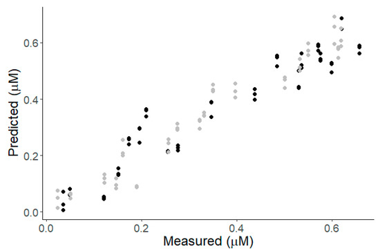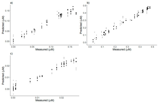 Relationship between the NIR-predicted values and concentrations of PSP toxins (a) C1 + 2, (b) GTX5 and (c) dcSTX, as determined by HPLC-FLD (black and gray dots are calibration and validation samples, respectively).