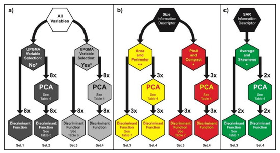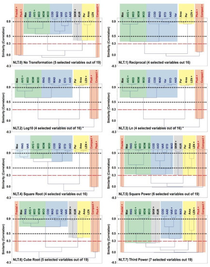 Figure 3). We investigate several Non-Linear Transformations (NLTs—see Phase 4: Data Transformation Approaches) and various strategies to select uncorrelated attributes: we tested more than 32 combinations of Data Transformation Approaches, i.e., eight NLTs versus four input dataset versions (see Set.1, Set.2, Set.3, and Set.4 in Phase 7: Discriminant Function—