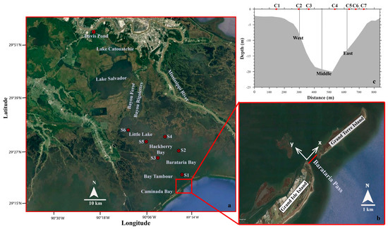 Barataria Bay (Figure 1) is located at the southeastern Louisiana, on the western side of the Mississippi Birdfoot Delta. It is connected to the Gulf of Mexico through several tidal inlets including Barataria Pass, which is between two barrier islands, Grand Isle Island and Grand Terre Island (Figure 1b). The most significant freshwater source inside the Barataria Bay is the Davis Pond freshwater diversion. The maximum diversion discharge is ~300 m3 s−1 [23]. Barataria Pass is an 800 m wide narrow channel. It is one of the four main tidal passes of Barataria Bay, accounting for ~66% of total water exchange [24]. Tidal currents account for ~85% of the total flow variance in the inlet, with equal contributions from the O1 and K1 constituents. Tidal amplitudes for both O1 and K1 constituents are about 0.5 m s−1 [25]. Maximum tidal currents reach as high as 2 m s−1 during tropic tides.