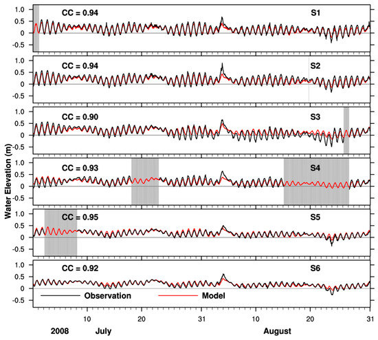 We use the Pearson correlation coefficient [34] as evaluation metrics. Two-month (1 July to 31 August 2008) time series of water elevation for both observation and model simulation are shown in Figure 3. The model reproduces the observed tidal variations, including tropic-equatorial modulation, as well as wind-driven water level set-up and set-down with all correlation coefficients above 0.9.