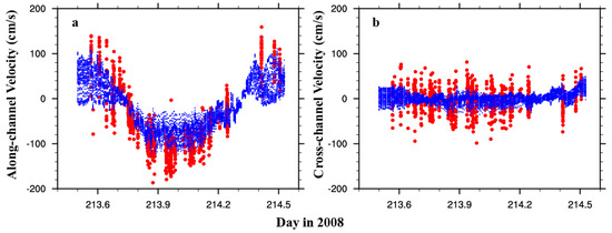 (a) Along-channel velocity at 1.32 m below the surface for observed (red dot) and modeled (blue dot) data; (b) Cross-channel velocity at 1.32 m below the surface for observed (red dot) and modeled (blue dot) data.