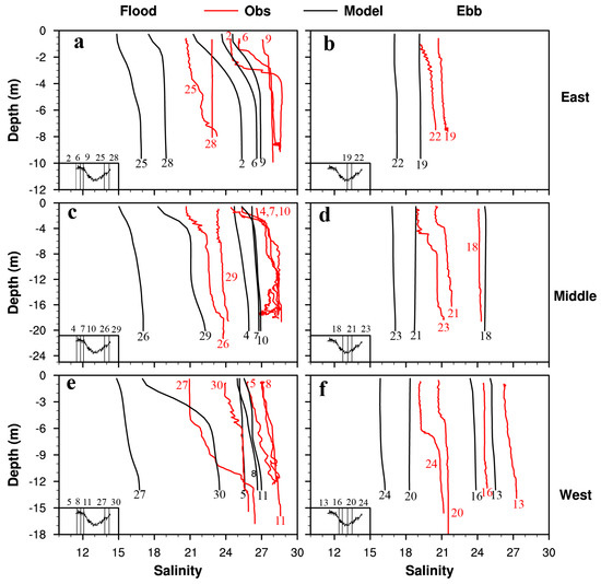 Vertical profiles of salinity comparison between in situ observation (red) and simulation (black). The numbers in the plot represent the sequence of CTD casts. Left panels are for flood tides (a,c,e), while right panels for ebb tides (b,d,f). Top, middle, and bottom row are at the eastern (a,b), middle (c,d), and western (e,f) side of the channel, respectively. Water level elevation in the deep channel is shown in the bottom-left small panel, with vertical lines showing casting times.