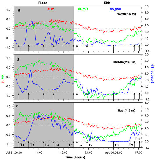 Time series (06:00 31 July to 07:40 1 August 2008) of water level elevation (red), depth-averaged along-channel velocity (green), and bottom-top salinity difference at (a) western shoal, (b) deep channel, and (c) eastern shoal. Shaded area represents flood tide. Arrows show different stages during a tidal cycle.