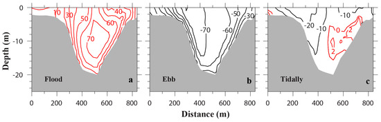 Transverse distribution of (a) flood-, (b) ebb-, and (c) tidally-averaged along-channel velocities, looking up-estuary (unit: cm/s). Red isolines represent flood velocities, while black isolines ebb velocities.