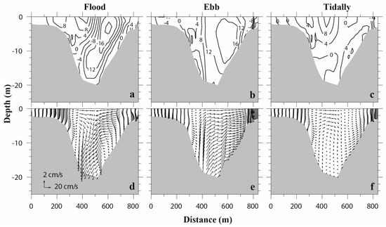 The transverse structure of cross-channel residual current also differs significantly between ebb and flood tides. The maximum flood-averaged and ebb-averaged velocity can reach 0.2 m/s and 0.16 m/s, respectively. The ebb-averaged velocity exhibits no horizontal divergence or convergence in the deep channel (Figure 8b,e), while the flood-averaged velocity shows a strong convergence close to the surface in the mid-channel (Figure 8a,d). However, no closed cell circulation exists for the flood average (Figure 8d), which is different from that described in Nunes and Simpson [1]. The tidally averaged cross-channel velocity is relatively weaker (Figure 8c), and it displays a clockwise circulation cell in the western channel and an even weaker counterclockwise cell in the eastern channel (Figure 8f).