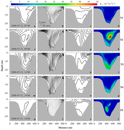 Cross-sectional profiles of currents , salinity and vertical viscosity during ebb tide. The first column (a,e,i,m,q) is along-channel velocity, the second column (b,f,j,n,r) secondary circulation, the third column (c,g,k,o,s) salinity, and the last column (d,h,l,p,t) vertical viscosity. The velocity contour interval is 0.2 m/s, positive is landward. The salinity contour interval is 0.5. Each row corresponds to a time instance indicated by an arrow in Figure 6.