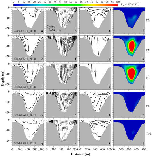 At the beginning of ebb tide (T6), although the along-channel ebb current increases to ~0.4 m/s (Figure 10a), the salinity distribution and vertical stratification (Figure 10c) are almost the same as that of T5. There is a weak (less than 0.1 m/s) eastward lateral flow below 6 m (Figure 10b).