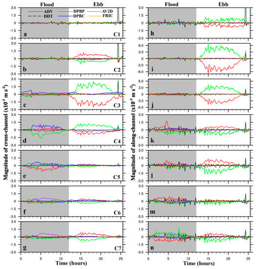 Time series of vertically averaged momentum equation terms in the cross- (a–g) and along-channel (h–n) directions during the same 25.6 h tidal cycle. The left column is for the cross-channel direction. The right column is for the along-channel direction. DDT (dash black) represents the local acceleration, AVD (red) the non-linear advection, COR (pink) the Coriolis force, DPBP (green) the barotropic pressure gradient, DPBC (blue) the baroclinic pressure gradient, AV2D (purple) the difference between 2-D and 3-D nonlinear terms, FRIC (orange) the bottom friction, and HDIF (yellow) the horizontal diffusion. Shaded areas indicate flood tide. Stations (C1–C7) from top to bottom are located from the west to the east shown in Figure 1c. Note that the y-axis scales for Figure (i,j) are different from others.