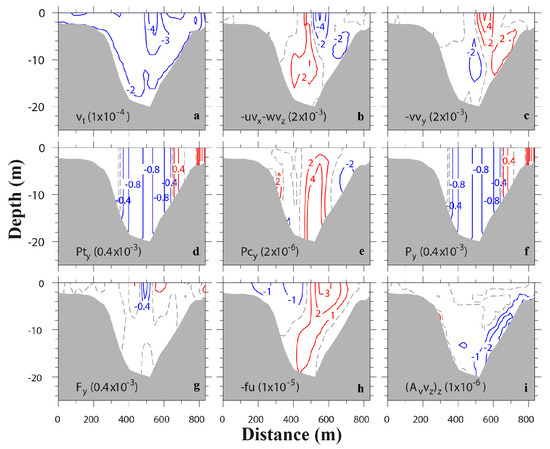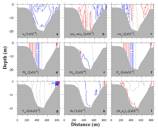 Transverse distributions of terms (m/s2) in cross-channel momentum equation at ebb (T7). Terms include (a) local acceleration, (b) lateral advection, (c) along-channel advection, (d) barotropic pressure gradient, (e) baroclinic pressure gradient, (f) total pressure gradient, (g) horizontal stress divergence, (h) Coriolis force, and (i) vertical stress divergence. Red isolines represent positive values, while blue isolines negative values. Dash line shows contour 0. The contour intervals are shown in parenthesis.