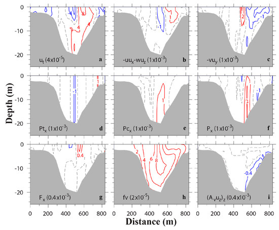 Transverse distributions of terms (m/s2) in along-channel momentum equation at ebb (T7). Terms include (a) local acceleration, (b) lateral advection, (c) along-channel advection, (d) barotropic pressure gradient, (e) baroclinic pressure gradient, (f) total pressure gradient, (g) horizontal stress divergence, (h) Coriolis force, and (i) vertical stress divergence. Red isolines represent positive values, while blue isolines negative values. Dash line shows contour 0. The contour intervals are shown in parenthesis.