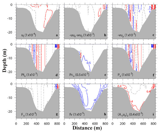 Transverse distributions of terms (m/s2) in along-channel momentum equation at flood (T3). Terms include (a) local acceleration, (b) lateral advection, (c) along-channel advection, (d) barotropic pressure gradient, (e) baroclinic pressure gradient, (f) total pressure gradient, (g) horizontal stress divergence, (h) Coriolis force, and (i) vertical stress divergence. Red isolines represent positive values, while blue isolines negative values. Dash line shows contour 0. The contour intervals are shown in parenthesis.