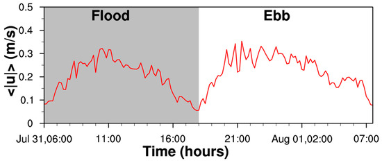 Here, we follow Lerczak and Geyer [2] using the cross-channel average of depth-averaged velocity amplitude ( is the absolute value of depth-averaged cross-channel velocity, A is the cross-channel area) to represent the strength of the lateral flow. The result is shown in Figure 16. The maximum during flood is 0.32 m/s, while the maximum during ebb is 0.34 m/s. Generally, cross-channel current amplitude during ebb is comparable, even slightly greater than that during flood, which is different from the idealized case [2], in which lateral circulation is about four times stronger during flood tides than during ebb tides. However, this inconsistence is also observed in James River estuary [14], where the lateral circulation shows no flood–ebb asymmetry during spring tides, and a reversed asymmetry during neap tides, that is stronger during ebb than during flood. Li et al. [14] attribute negligible flood–ebb variations during spring tides to turbulent mixing, which in their numerical experiment was simulated via a turbulence closure model. It reduces the vertical shear and the flood–ebb asymmetry in the vorticity generation. In comparison, the idealized case of Lerczak and Geyer [2] used a constant eddy viscosity. In our numerical experiment, turbulent mixing is simulated using the Mellor-Yamada 2.5 turbulence closure model and the 25.6 h diurnal tidal cycle is close to tropic tide. Maximum turbulent vertical viscosity is twice as great during ebb (Figure 10, last column) as during flood (Figure 9, last column). Therefore, our simulation result is more similar to Li et al. [14] than to Lerczak and Geyer [2].