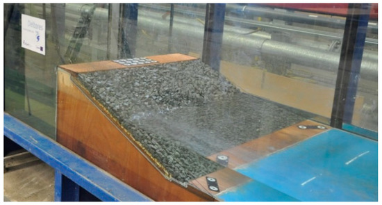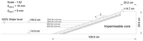 The cross-section of the model set-up used in the Deltares tests is shown in Figure 3. During these tests, only the damage to the front slope was evaluated. In this study, only the straight slope configuration is considered. The test program, including slope configurations with a berm, is described in the works of [8,9]. Incident wave heights were depth-limited given that an 8 m long foreshore was present in this model. The model (considering reference wave climate in the Dutch coast) followed the Froude criterion. Moderate Reynolds (Re > 1 × 104) ensured turbulent conditions in the filter and armor (no permeable core) and negligible scale effects. In addition, the wave generation equipment included active compensation for the reflected wave at the wave board.