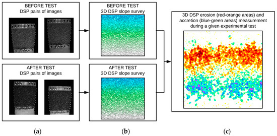 Digital stereo photography (DSP) workflow. (a) Pairs or images from the surveyed slope, before and after a test, (b) 3D slope survey before and after a test (white color being the lower part of the slope, and blue color being the higher part of the slope), (c) erosion and accretion measurement following a given test (red-orange areas being erosion areas, and blue-green areas being accretion areas).