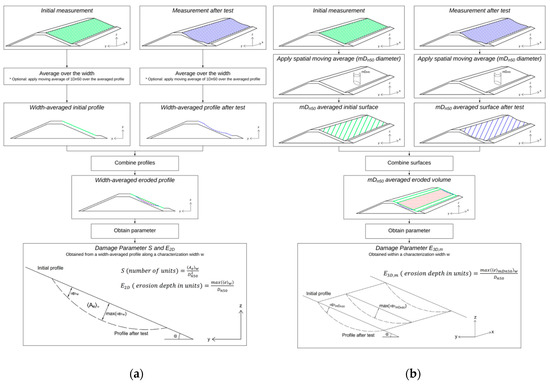 Damage parameters methodology. (a) S and E2D parameters obtained from a width-averaged profile, (b) E3D,m parameters obtained from the maximum erosion depth observed within a given characterization width.
