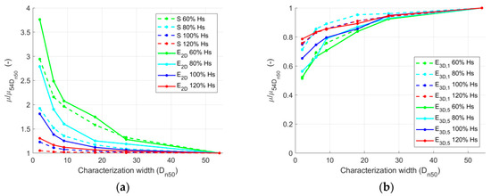 Characterization width. Mean damage variation (bias), calculated as the mean damage from each characterization width (μ) divided by the mean damage from the 54Dn50 characterization width (μ54Dn50). (a) S and E2D parameters, (b) E3D,1 and E3D,5 parameters.