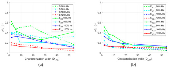 Characterization width. Standard deviation of the damage (σ) divided by the mean of the damage (μ), for each characterization width (random error). (a) S and E2D parameters, (b) E3D,1 and E3D,5 parameters.