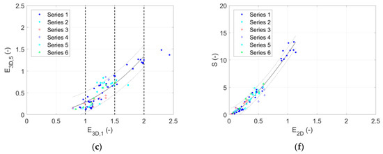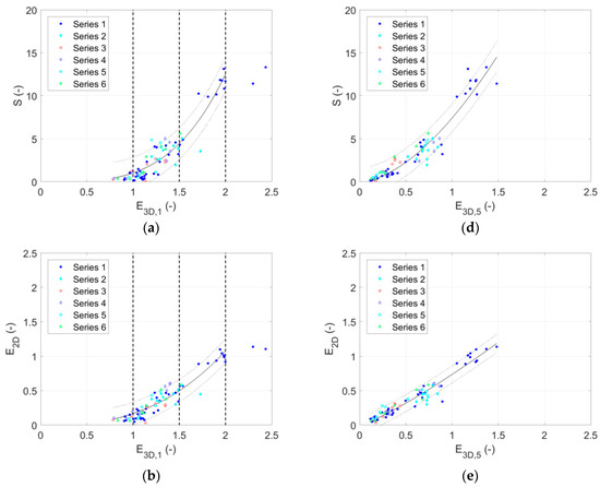 Comparison of all damage parameters (for 27Dn50 characterization width). (a) E3D,1 vs. S parameters, (b) E3D,1 vs. E2D parameters, (c) E3D,1 vs. E3D,5 parameters, (d) E3D,5 vs. S parameters, (e) E3D,5 vs. E2D parameters, (f) E2D vs. S parameters.